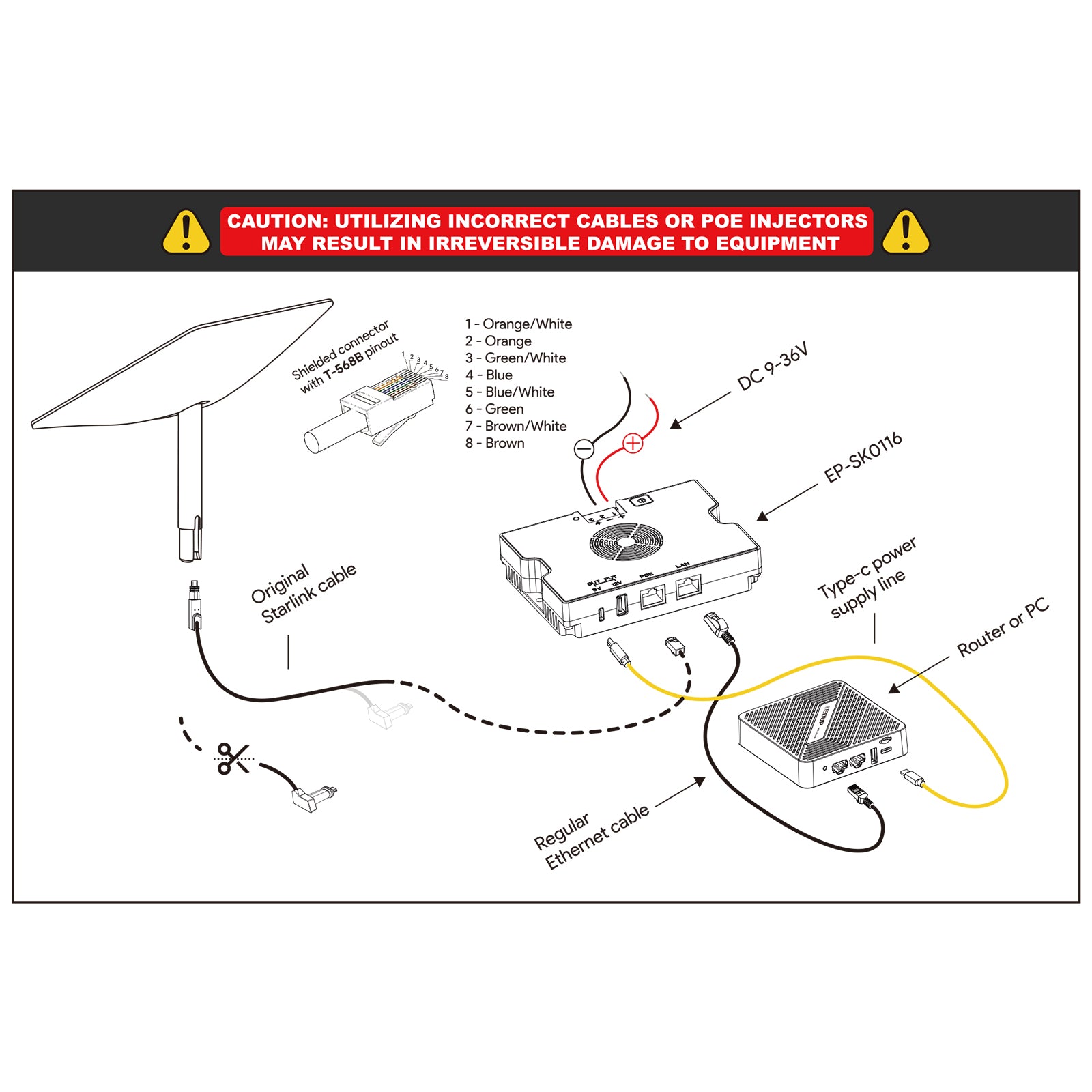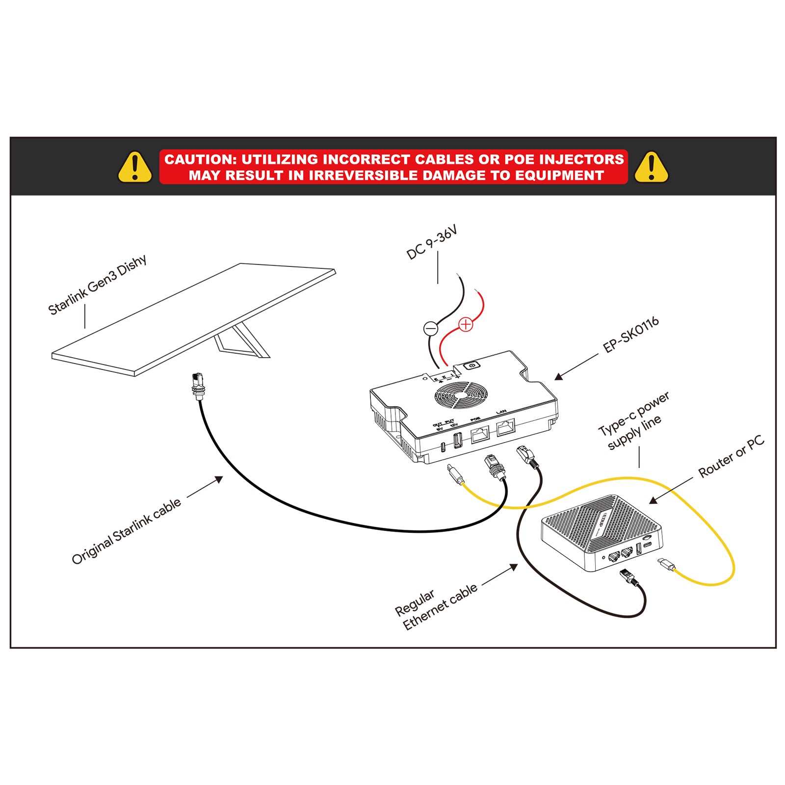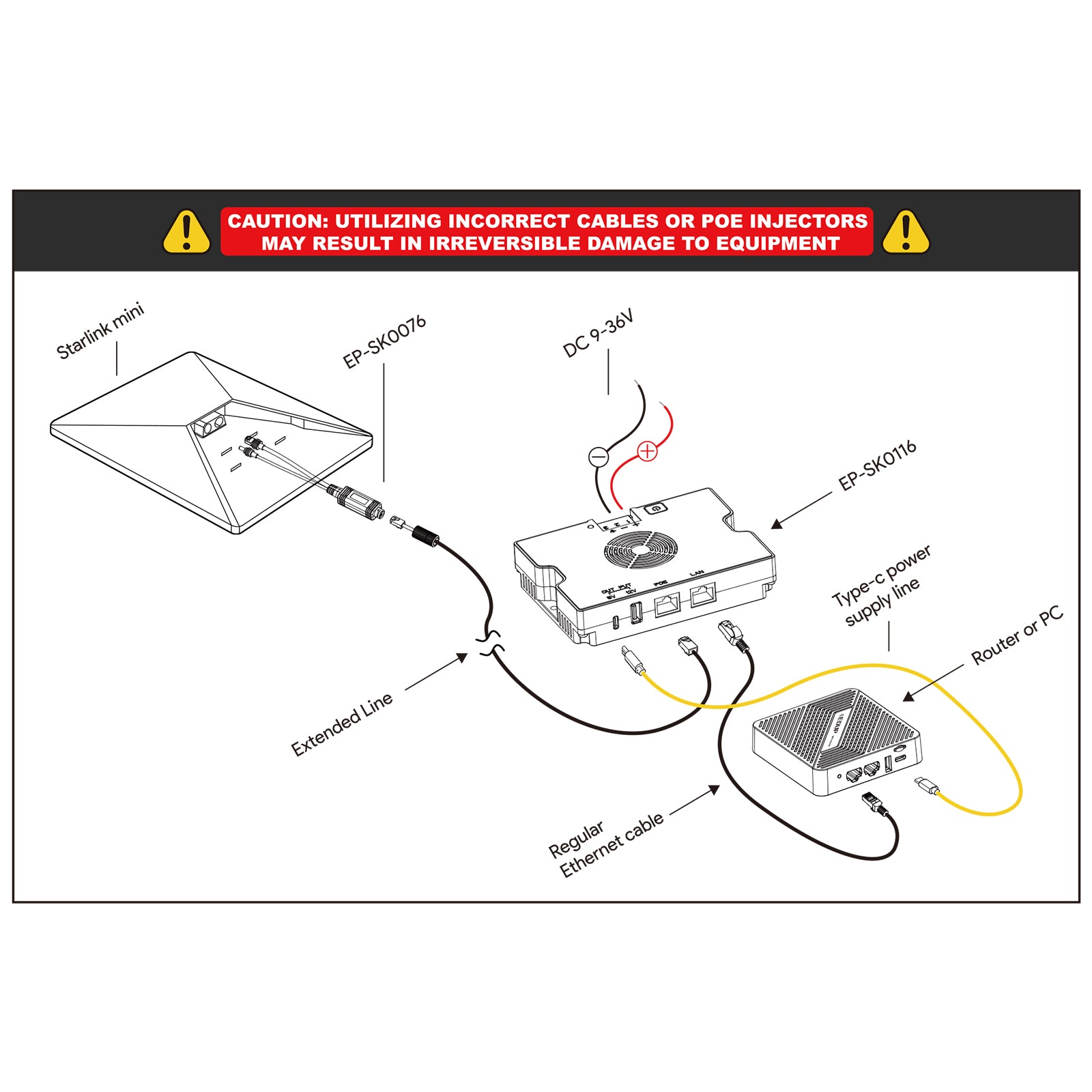 - Niet gebruiken met de originele Starlink-router of andere PoE-switches — dit systeem werkt met passieve PoE-technologie van Starlink.