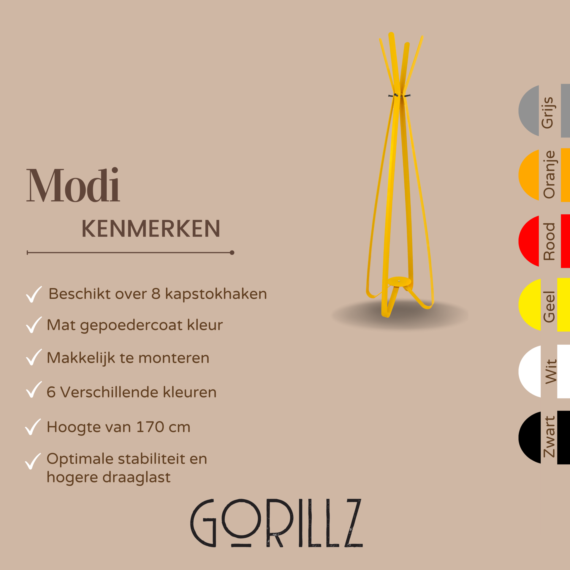 Staande kapstok Modi van Gorillz heeft een moderne en industriële uitstraling. Het is voorzien van maar liefst acht diverse haken en is gemaakt van hoogwaardig staal. Deze kapstok zorgt voor een nieuw en rustieke look in uw interieur. Daarnaast heeft het een compact en licht design, waardoor u het gemakkelijk op de gewenste plek kan plaatsen en neemt het weinig tot geen ruimte in beslag!