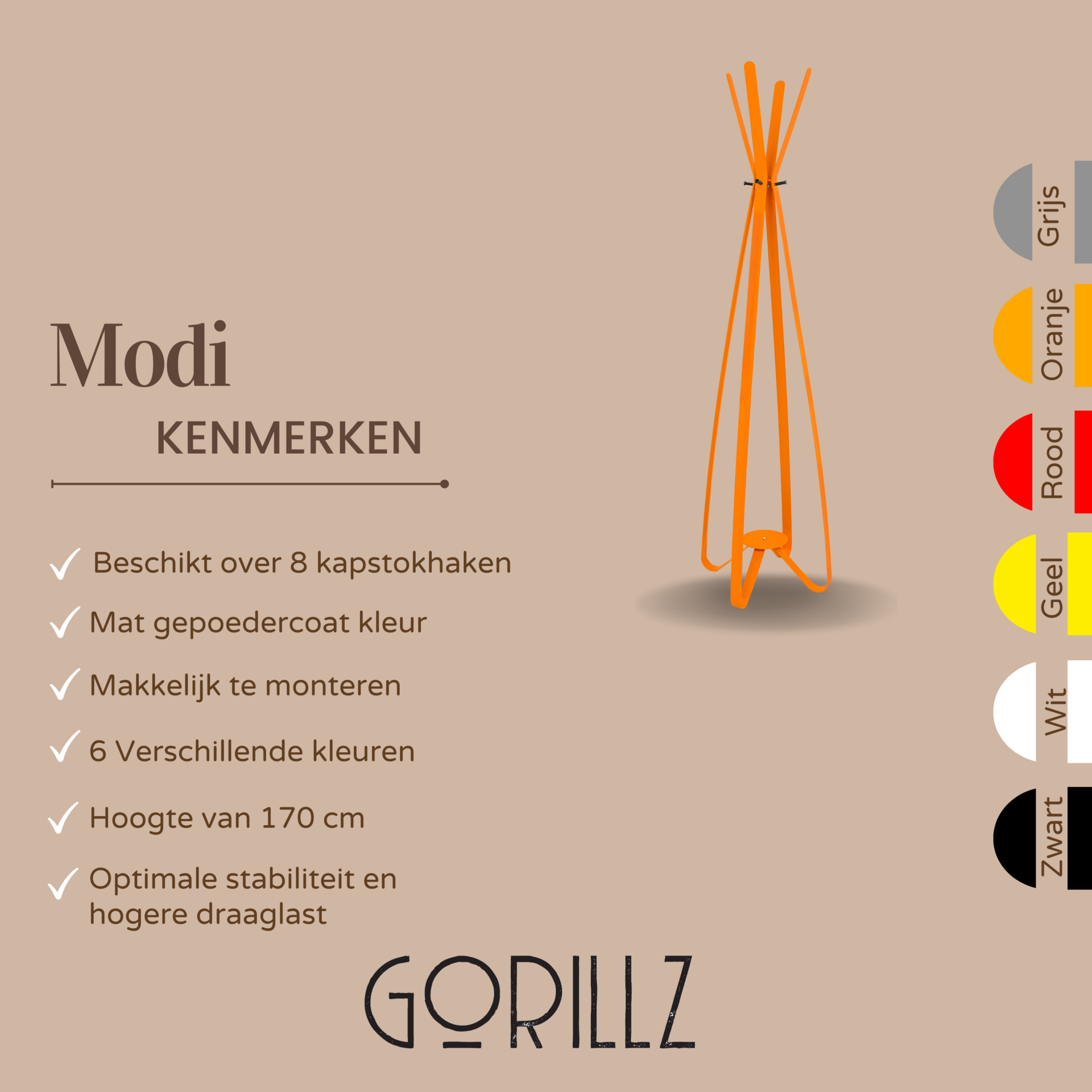 Gorillz Modi - kapstok staand- staande kapstok - 8 haken - Metaal - 170 cm - Oranje
