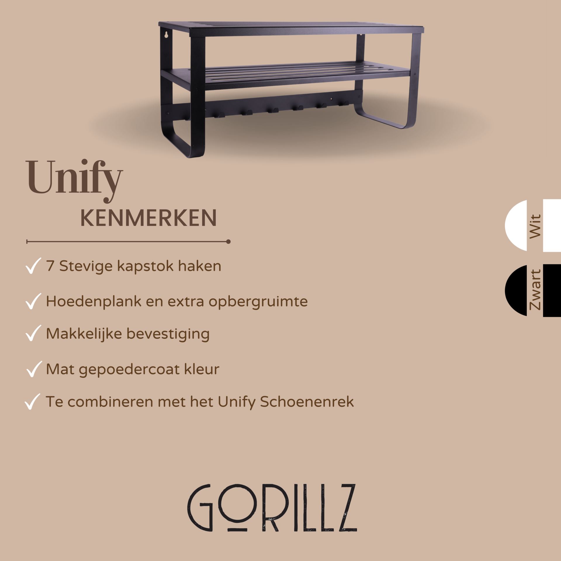 De Gorillz Unify Wandkapstok met hoedenplank is een echte eyecatcher. Maak gebruik van de 7 stevige haken om jassen op te hangen. Naast jassen, biedt de wandkapstok plek voor hoeden op de hoedenplank. Er is zelfs een extra plank aanwezig voor overige spullen. Het hoogwaardige metaal is enorm duurzaam en makkelijk te bevestigen aan de muur. Kies uit een witte of zwarte kapstok en combineer hem met het Unify Schoenenrek voor een compleet garderoberek.