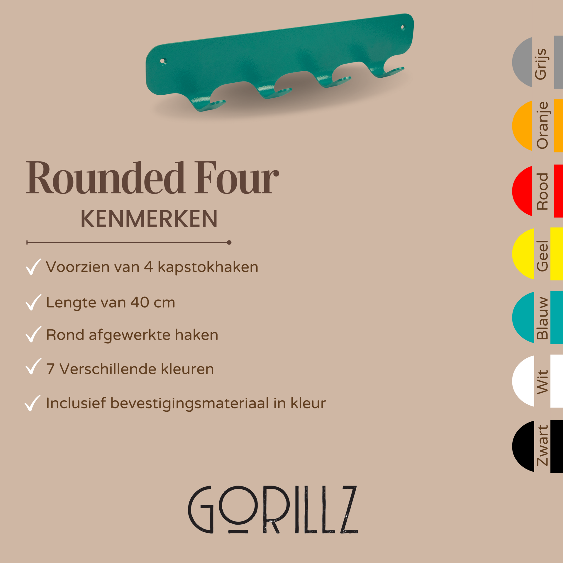 De Rounded Four, met zijn tijdloze industriële ontwerp, beschikt over vier kapstokhaken die een chique uitstraling toevoegen aan elke ruimte. Verkrijgbaar in diverse maten en kleuren, waaronder wit, zwart, grijs, babyblauw, geel, oranje en rood, biedt deze wandkapstok de mogelijkheid tot eindeloze combinaties met uw interieurdecoratie.
