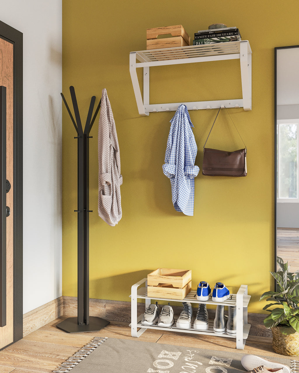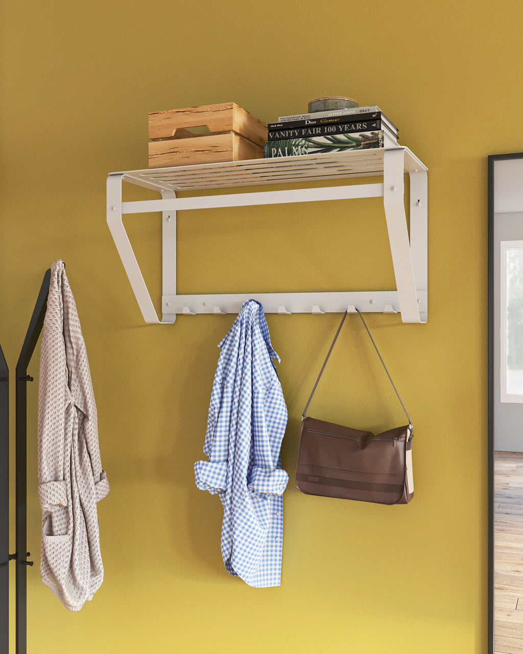 Met 7 haken kunnen voldoende jassen worden opgehangen aan deze kapstok. Naast jassen is er ook nog ruimte voor overige spullen. Gebruik hiervoor de plank boven de haakjes. De hoogste plank is geschikt voor hoofddeksels en overige spullen. Zo heb je alles bij de hand en dicht bij elkaar. Je bespaart op deze manier veel ruimte.