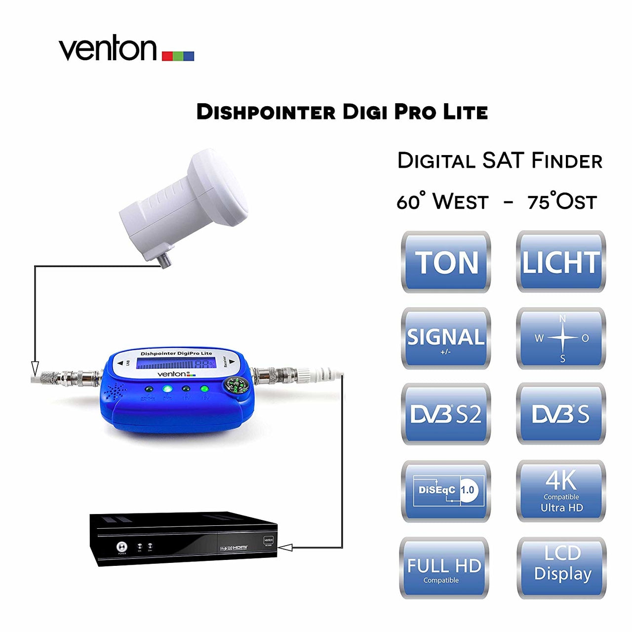 De satellietzoeker van het merk Venton is zeer gemakkelijk te gebruiken deze Satfinder is vaak universeel bijna geschikt voor elke satelliet die te ontvangen is en heeft een zeer snelle piek op de satelliet.De Venton DigiPro lite is Digitaal en heeft een Diseqc functie em daar naast is deze Satfinder ook wel geschikt voor 4k Satelliet signalen te vinden . Met de ingebouwde kompas kunt u gemakkelijk de positie bepalen van het satelliet en er zit ook nog een nacht functie met een licht erop zo dat u op elke moment de schotel kunt uitrichten .