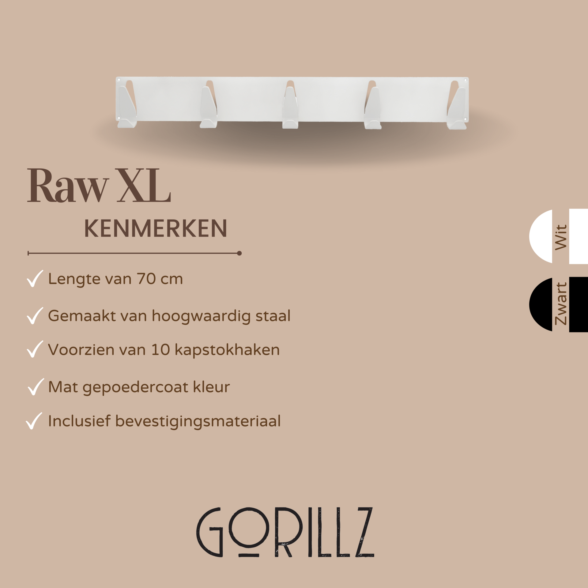 Gorillz Raw XL - Industrieel kapstok - 10 Kapstok haken - 70cm - Wit
