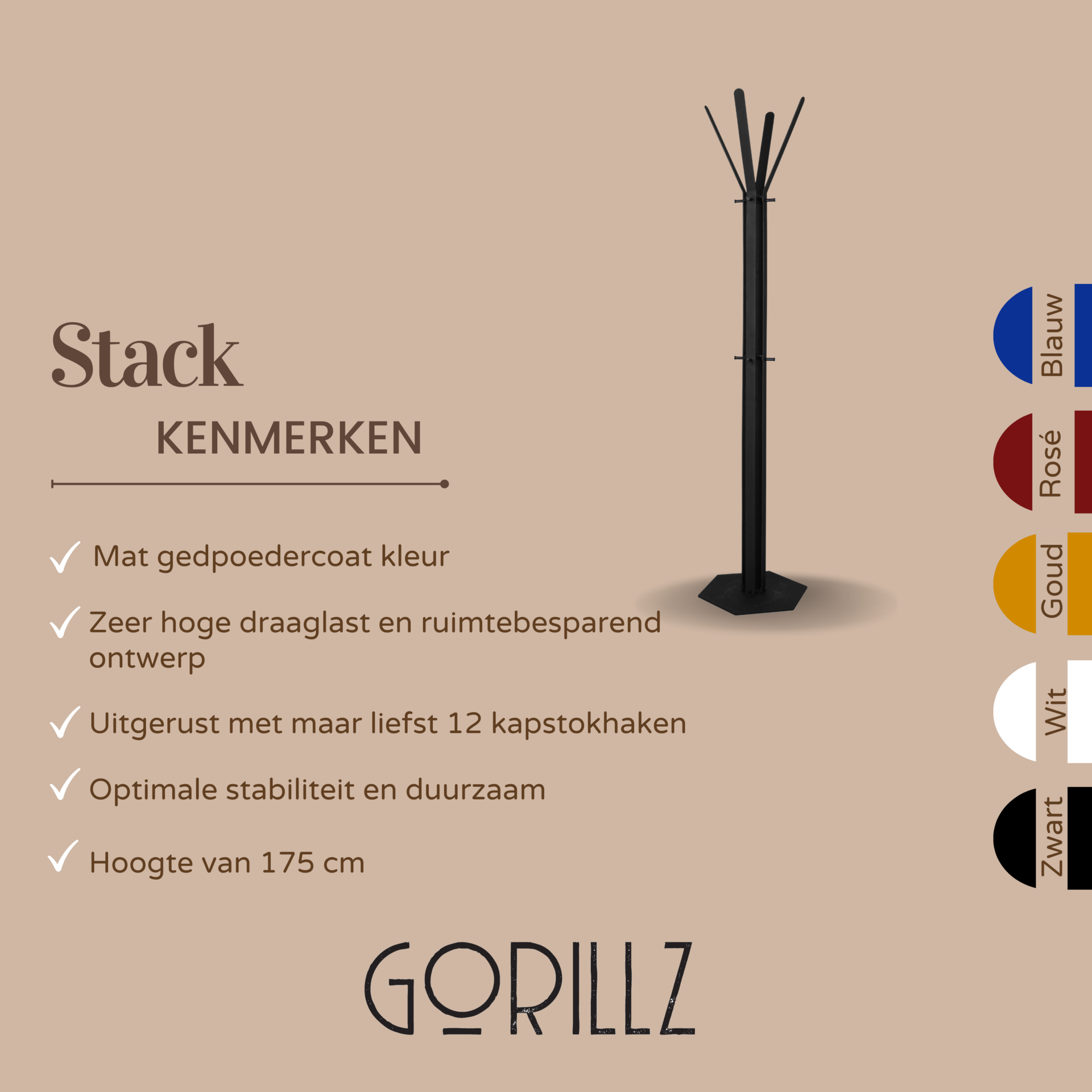 Gorillz Stack - Kapstok Staand - Staande kapstok	- Metaal - 12 Kapstok haken - 174,5 cm - Zwart